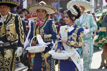 Mientras que las coloridas faldas de las mujeres están  bordadas con hilos multicolor y adornadas con chaquira y pedrería. También acompañan sus implacables atuendos con aretes, moños y peinados elaborados, velos sobre el rostro, paliacates bordados en la cintura y canastas con dulces que fueron repartidos entre el público a lo largo del recorrido.